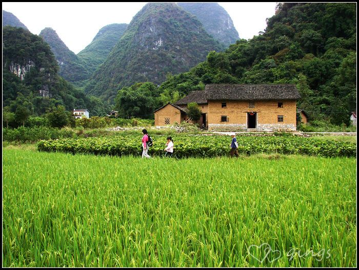 假期里,阳朔县城已然爆满,人车鼎沸。由于我们带着孩子,只好放弃了骑车去遇龙村的打算,坐大巴在遇龙村口下了车,从遇龙桥开始延河边徒步。