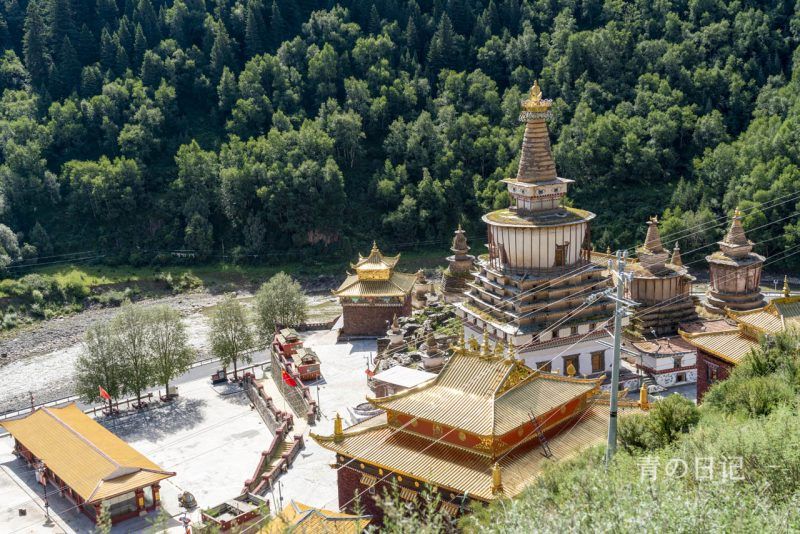 寺庙背靠瞻巴拉山,面对象山和大渡河支流则曲河。眺望象山伸出长鼻畅饮则曲渡河水,把河流弯曲成“U”字形,妙不可言。瞻巴拉山像一尊神佛塑像巍然屹立,著名的佛教密宗修行圣地密咒修行洞、仙人洞、格萨尔修行洞、喜瓦拉传承修行洞,吉祥八宝物、转王七宝分布其中。传说公元前4世纪印度的一位圣人跋山涉水来到这里修行成佛。