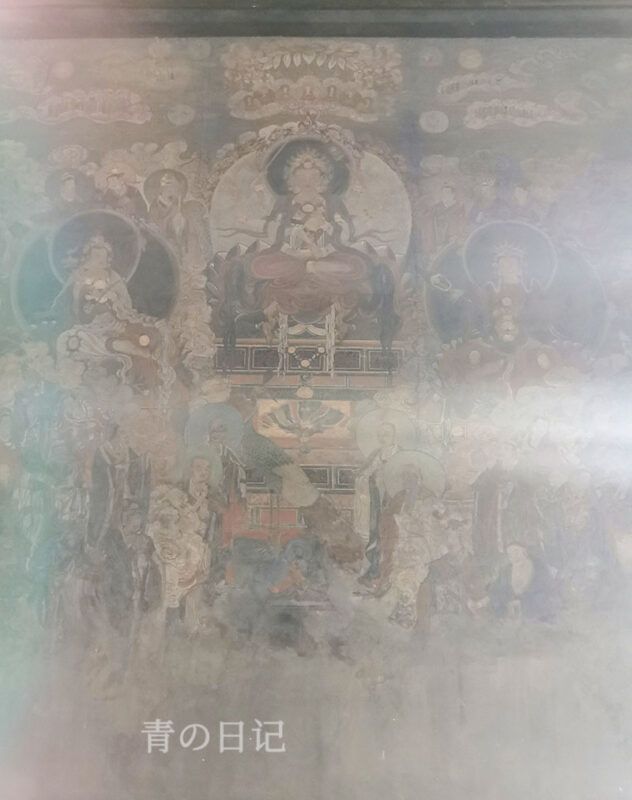 殿内西、南两壁之上,绘有《弥陀法会图》等壁画190平米,仍有辽金风韵遗存,为清朝康熙二十五年(1686年)至四十七年(1708年)所绘壁画,内容均为佛教故事。