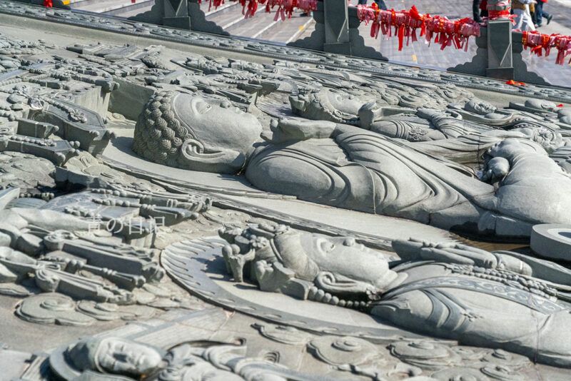 山门广场区域面积约15万平方米,由佛光门、般若门、菩提门及圆融门4部分组成,两侧有十八罗汉造像。