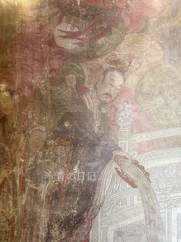 北墙上的北门两侧的两幅壁画分别是“帝后放飞图”和“帝后放生图”,画中主角都是皇帝、皇后以及6名陪伴的侍女。这些壁画均采用明代沥粉堆金工艺,虽然比法海寺晚70年,是明代中期的作品,但这两幅壁画也是皇家画师所为,其手法讲究,出手不凡,达到了较高的艺术水平。