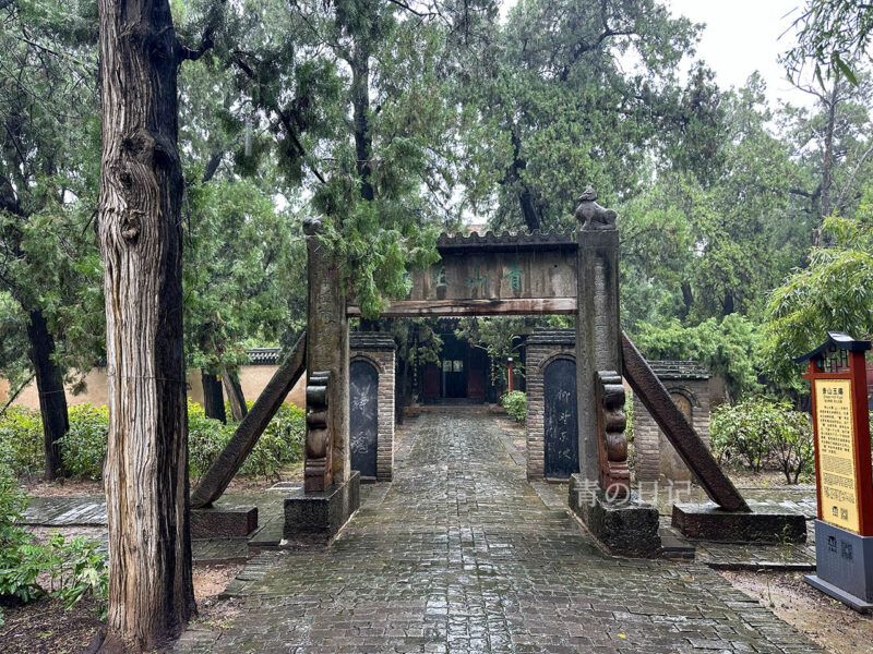 陵园神道上古柏相应,石柱、石马、石羊、石虎、石人相对排列。墓园内的红石牌坊,为明代郏县学者王尚絅所立,后至清道光甲申年知县李虎臣又将石坊重修一新,坊楣上写着四个行书大字“青山玉瘗”为王尚絅所题。两边石柱上所刻的对联:“是处青山可埋骨,佗年夜雨独伤神。”是苏轼在“乌台诗案”中被关押在御史台监狱写给弟弟苏辙的绝命诗《狱中遗子由》。