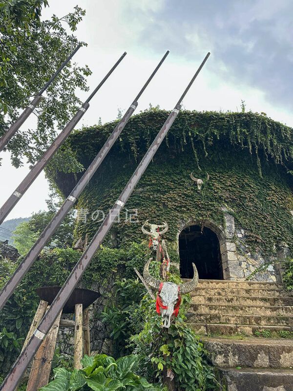 禾仓是瑶山古寨标志性的历史古建筑,有的禾仓已存在上百年。禾仓建筑独特,用四柱支撑,上层垫以木板,周围用竹篱笆围成圆形,顶上盖以毛糙,这些禾仓里面用来存放粮食和贵重物品,具有防潮、防盗、防鼠的功能。禾仓下面通常会放置一些生产工具,或者供寨上的人们聚会聊天。