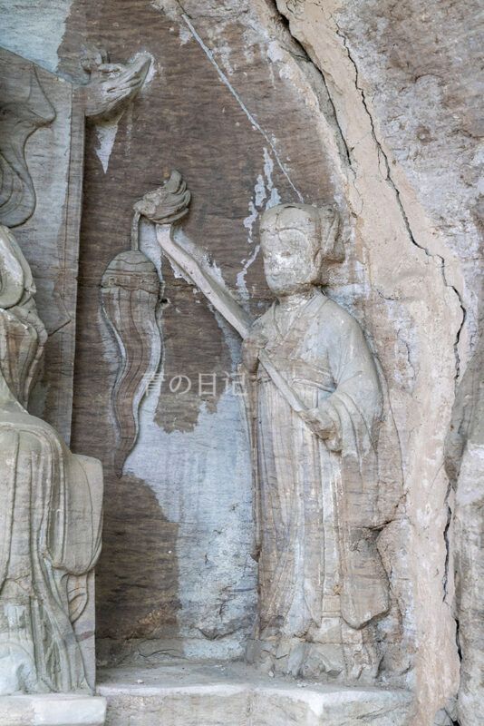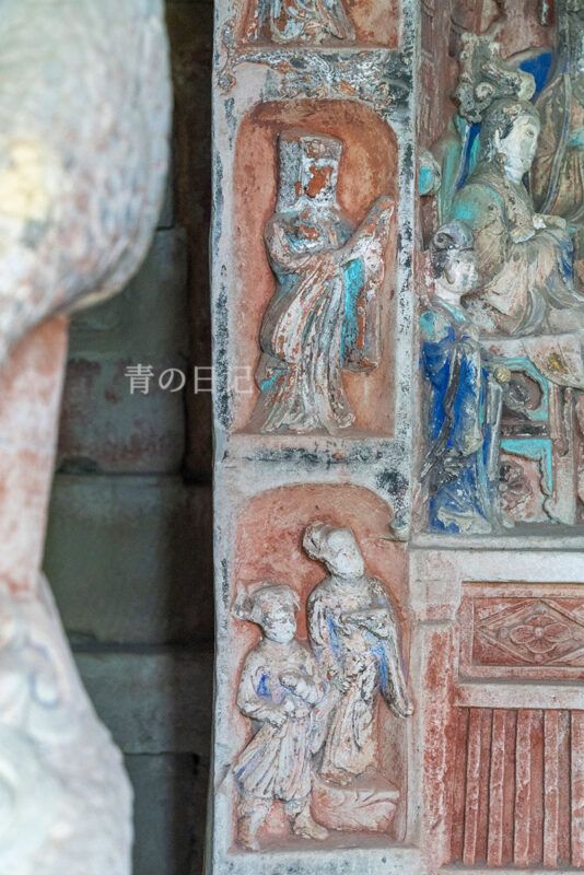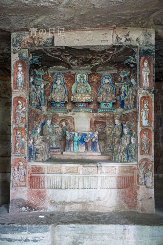 圣母龛。宋刻,高3.15米,宽2.75米,深1.63米,正壁刻后土三圣母,头顶悬八角形华盖,梳高髻,戴孔雀金钗,面容慈祥,身着宽袖华服,双手捧物,足蹬朝靴;端坐于龙头靠椅上,俨然人间贵妇。圣母像两侧,躬身直立女侍像,梳丫髻,着长服,手持龙首拂尘,神情静穆。左侧壁刻“九天监生大神”,顶盔贯甲,手持法器;尽职守护。右侧壁“九天送生夫人”,金钗霞帔,飘带飞拂,似把吉祥送至人间。此外,左侧壁外端刻戴直角幞头,身着朝服的供养人(出资镌造者)何正言及家眷,侧身礼拜。