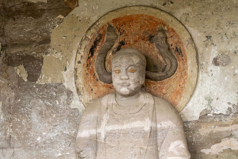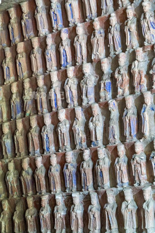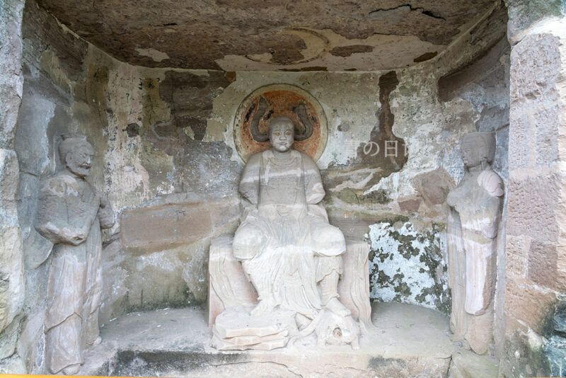 真武窟。宋刻,高2.35米,宽2.75米,深1.65米,后壁为真武大帝坐像,左脚踏鬼,右脚踩象,形象庄严。窟顶有一太极图。