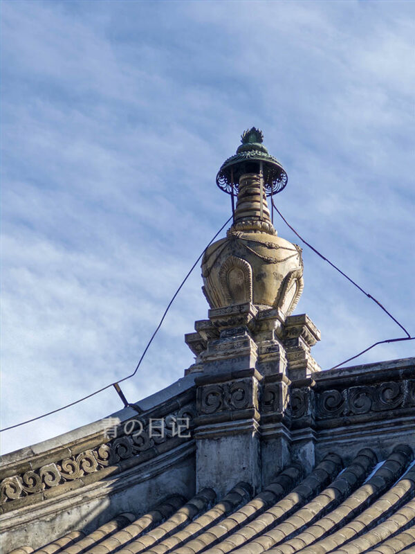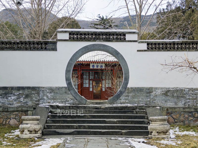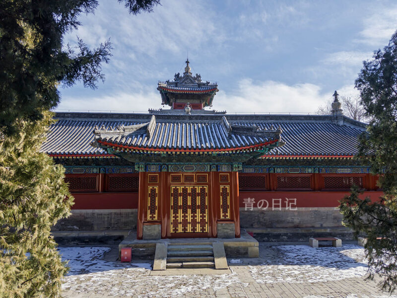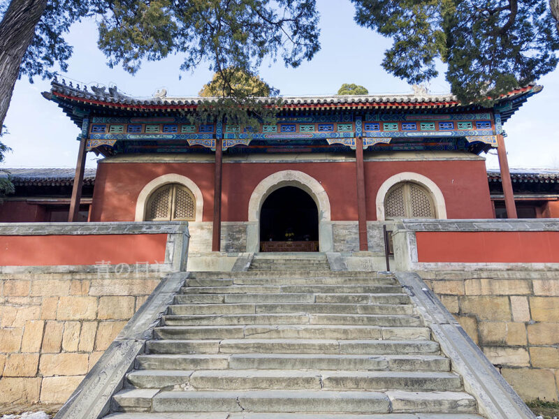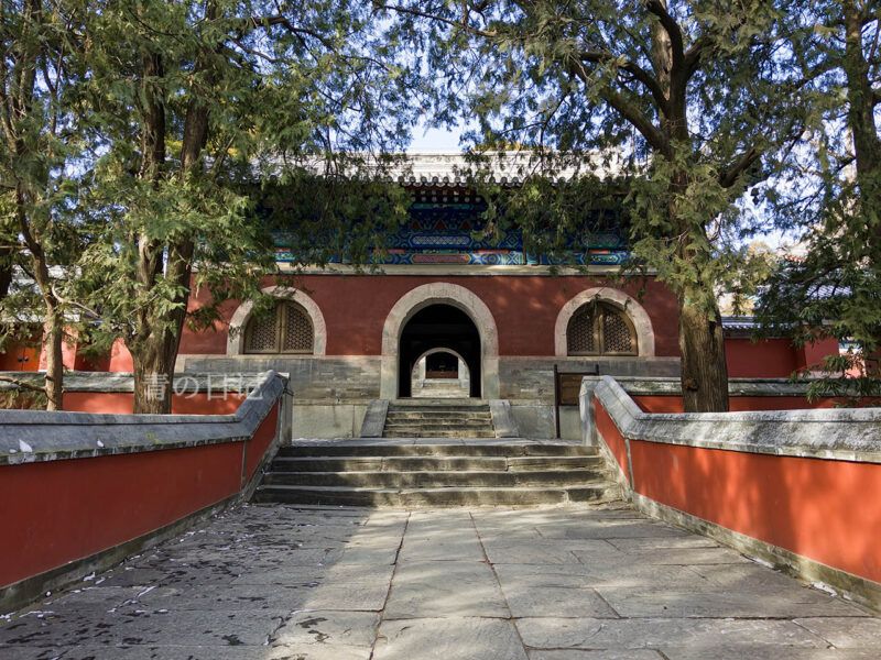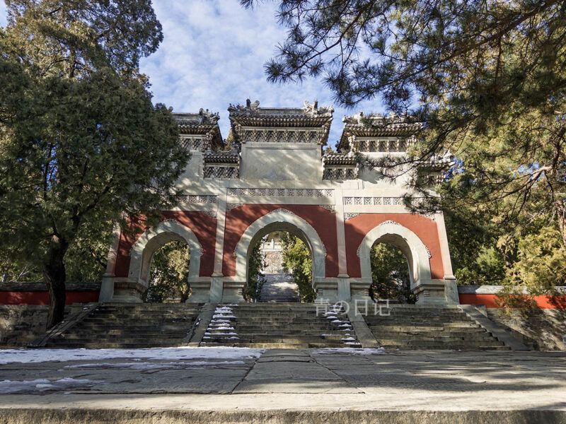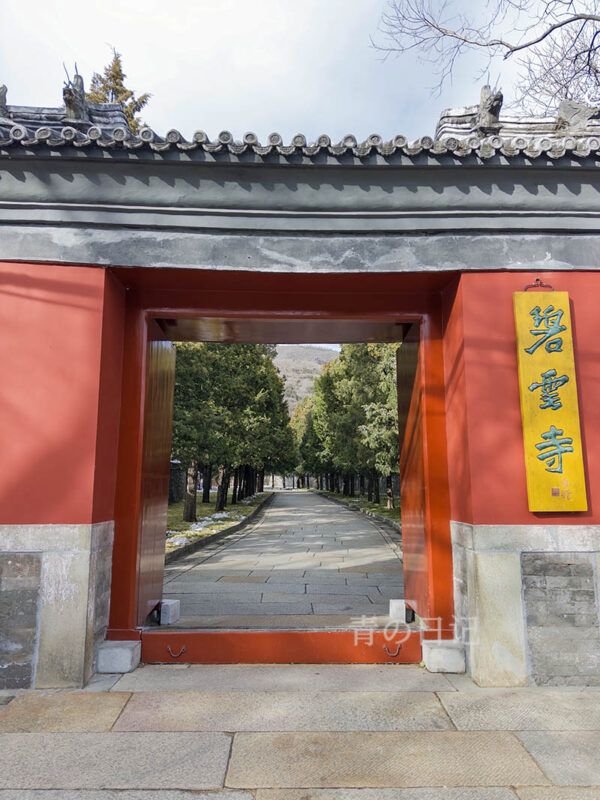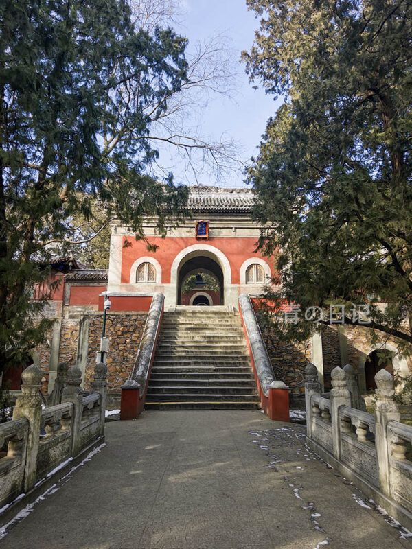 外山门,面阔三间,明间开券门洞,两次间各开一券顶窗,窗扇是三交六椀菱花图案。门上挂有蓝底金字匾,上用满、汉、藏、蒙四种文字书写“碧云寺”,为乾隆帝御笔。