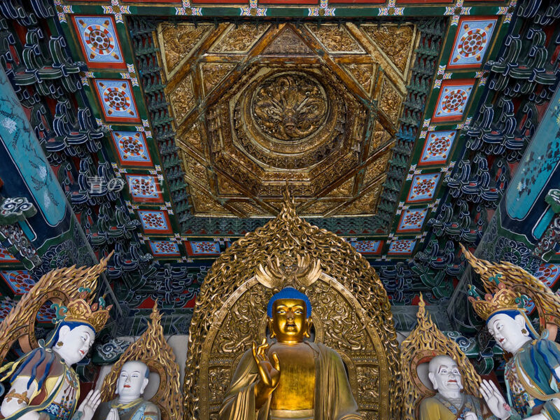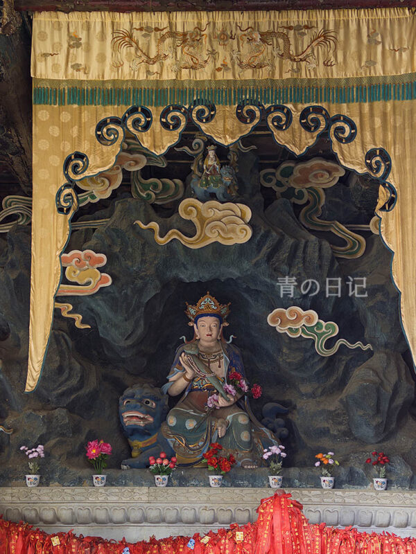 菩萨殿,建于明朝,面阔五间,中三间开隔扇门,两梢间开隔扇窗,隔扇图案都是三交六椀菱花图案,上朱色漆。喜相逢旋子彩画,卷草纹雀替。殿前设有走廊,檐柱为四方柱。廊内正檐下悬挂乾隆帝御笔“静演三车”匾额。菩萨殿内原有明代的5尊菩萨像,后来被毁,现在的是1995年重塑,自左至右依次为大势至菩萨(骑麒麟)、文殊菩萨(骑青狮)、观音菩萨(骑朝天吼)、普贤菩萨(骑白象)、地藏菩萨(骑谛听)。菩萨殿内两侧塑有二十四诸天像和福、碌、寿、喜四星像及悬山云海,悬山云海中有佛教故事雕塑。