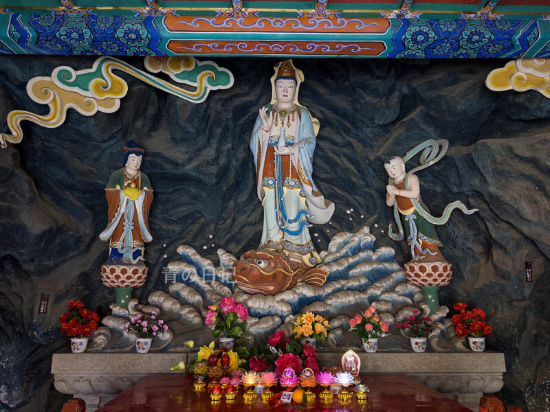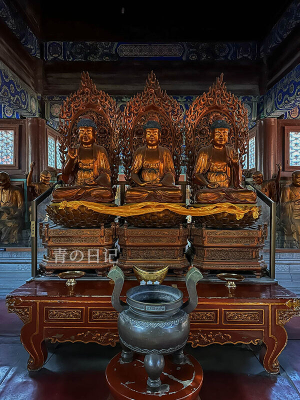 大雄宝殿,建于明朝,面阔三间,开有隔扇门和窗。门上悬挂“能仁寂照”匾额。现在的大雄宝殿内部陈设是1995年恢复的,殿内正中为释迦牟尼说法像,其左右两侧是阿难、迦叶,左右胁侍文殊菩萨、普贤菩萨面朝中央;殿内两侧有十八罗汉像及悬山云海,悬山云海中有《西游记》中的神怪形象;释迦牟尼说法像的背面有海岛观音塑像,面朝北,两侧是善财、龙女。大雄宝殿前两侧各竖一座六棱经幢,经幢前面是放生池,池上有一座雕栏石桥。