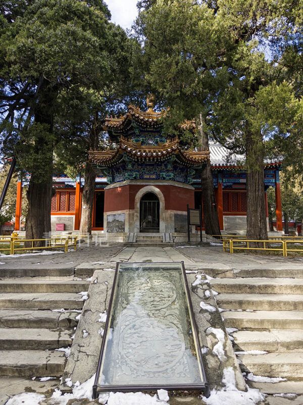 乾隆御制重修碧云寺碑亭,建于清朝乾隆十四年(1749年),重檐八角攒尖顶,顶覆黄琉璃瓦,上下檐饰斗拱,红墙红柱,二龙戏珠彩画。亭内为乾隆御制重修碧云寺碑文,碑身两侧雕刻缠枝莲纹,中央是乾隆帝用满、汉文书写的《御制重修碧云寺碑文》,记述了碧云寺历史沿革及规模,碑身下有龟趺海墁。碑亭前的御路上有一块陛石,装饰图案以凤为主,有鹤、蝙蝠等图案,但无龙。