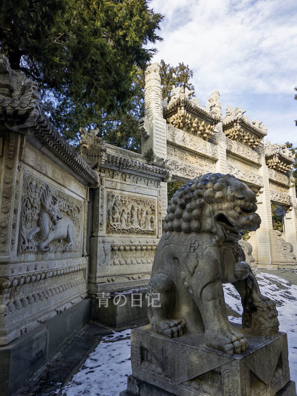石牌坊,是一座汉白玉的冲天石牌坊,四柱三间,仿木结构,单檐歇山顶。上枋刻飞鹤,下枋刻游龙,雕刻精美。石牌坊的匾额刻有“西方极乐世界阿弥陀佛安养道场”。石牌坊两侧有石雕八字照壁,共四面。其中两面与牌坊平齐,背面为雄狮,正面雕有八个中国历史人物浮雕,人物上方刻有题名:南侧照壁正面为蔺相如为节,李密为孝,诸葛孔明为忠,陶渊明为廉,正面小额枋刻有“精诚贯日”;北侧照壁正面为狄仁杰为孝,文天祥为忠,赵壁为廉,谢玄为节,正面小额枋刻有“节义凌霄”。另外两面向前斜伸为八字,正面为麒麟,背面为八仙(每面四位)。