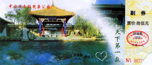 趵突泉 2010-05-04 2018-06-18 15-山东 / 门票收藏 趵突泉,号称“天下第一泉”,为济南72名泉之冠,四大泉群之首,三大名胜之一,泉城象征。公园地处市中心,面积约100亩,始建于1956年,是中国传统式山水园,气势恢宏的公园南大门被誉为中国园林“第一门”。 -> 浏览次数: 1,451